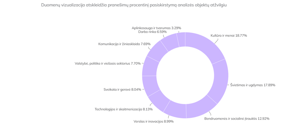 Surinkti duomenys leidžia įvertinti ne tik augimo mastą, bet ir tai, kokiuose kontekstuose kūrybiškumas įsitvirtino stipriausiai. Metinė dinamika rodo reikšmingą paminėjimų šuolį, tačiau didžiausia jų dalis vis dar siejama su kultūra ir menais (18,8 proc.) bei švietimu ir ugdymu (17,9 proc.). Šios sritys kartu sudaro beveik pusę viso matomumo srauto.
